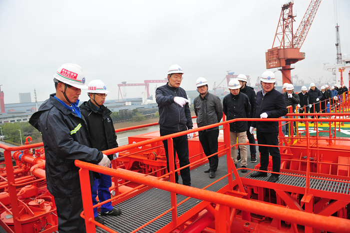 副董事长王建生、副总经理杜成忠以及生产管理部负责人陪同江南造船调研组一行,分别参观了扬子鑫福和新扬子造船生产现场并登船参观。在参观新扬子建造的83500DWT化学品组合船时,林董事长对这种集油、散货、化学制品三者兼装,能为船东提供灵活机动营运策略特种船型的设计理念,给予了高度评价。