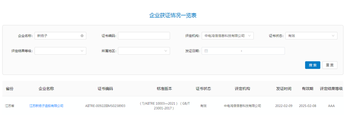 近期,两化融合管理体系评定管理平台公示了一批全国两化融合管理体系升级版贯标达标企业,我集团江苏新扬子造船有限公司成功评定为两化融合管理体系贯标(升级版)AAA级企业。截止2022年2月,全国两化融合AAA级企业共有65家。