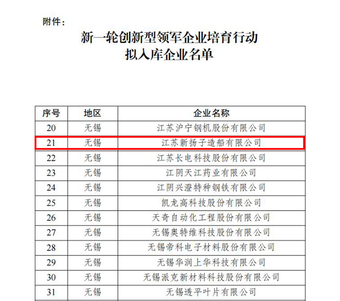日前,江苏省科技厅对新一轮创新型领军企业培育行动拟入库名单进行公示,我集团江苏新扬子造船成功入围,荣登榜单。