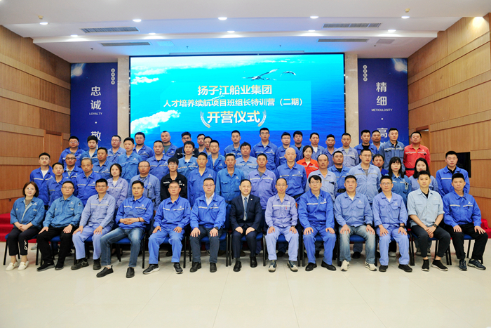 5月21日,扬子江船业集团人才培养续航项目第二期基本工班组长特训营开营仪式在新扬子行政大楼多功能厅顺利举行。新扬子造船副总经理倪荣,新扬子造船总经理助理兼集团综合管理部部长茆宏兆,扬子鑫福造船总经理助理刘银君,以及各子公司生产管理部、质量管理部、综合管理条线的相关领导、特训营所有学员、行动导师,共计82人参加了开营仪式。