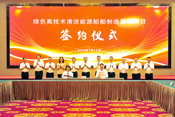 7月15日上午,扬子泓远绿色高技术清洁能源船舶制造基地项目正式签约落户靖江。靖江市委书记、经济技术开发区党工委书记张长平出席活动并致辞。靖江市委副书记、市长申强主持活动。我集团董事长任乐天,集团党委书记张宏飞等嘉宾,以及靖江市领导王瑾、张佳炜、张劲松、尹志华, 新桥镇领导陆红娟、吴益星,我集团副总经理周科伟、副总经理吉宏飞、总经理助理兼扬子鑫福造船总经理、扬子泓远造船总经理杨雪彦等参加活动。