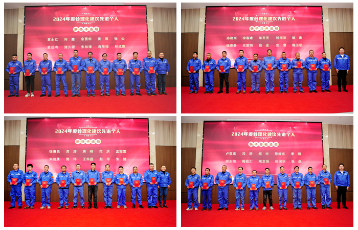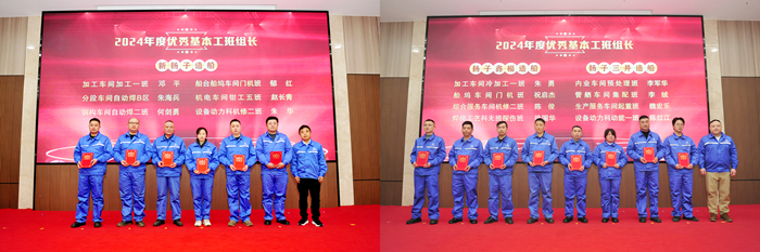 2024年,公司全体员工紧紧围绕年度工作任务,团结一心、迎难而上,以坚定的信念和不懈的努力,圆满完成了各项工作和生产任务。扬船人秉承“拼搏进取、勇于创新”的精神,在各自的岗位上辛勤耕耘、攻坚克难,展现了非凡的毅力和智慧。无论是生产一线,还是管理辅助部门,全体员工都以高度的责任感和使命感,朝着既定目标稳步迈进,为公司的发展注入了强劲动力。在这一年中,各条线、各部门涌现出一批批先进榜样,他们以卓越的表现和无私的奉献,成为公司前进道路上的旗帜。他们的努力不仅为公司创造了优异的业绩,也为全体员工树立了学习的标杆。为树立典型、表彰先进,大会上,对2024年度产生的9名突出贡献者、40名合理化建议先进个人、14名优秀基本工班组长、6个管理创新优胜项目、6个团队PK优胜项目、7个“四整洁”先进集体予以了表彰。