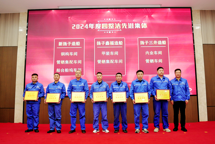 获得集团2024年度“四整洁先进集体”的分别是:新扬子造船的钢构车间、管舾集配车间和船台船坞车间;扬子鑫福造船的甲装车间和管舾集配车间;扬子三井造船的内业车间和管舾车间。