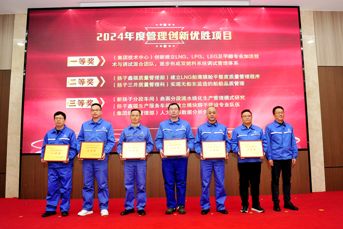 获得集团2024年度“管理创新优胜项目”一、二、三等奖的分别是:一等奖一项,来自集团技术中心;二等奖两项,来自扬子鑫福造船质量管理部和扬子三井造船质量管理科;三等奖三项,来自新扬子造船分段车间、扬子鑫福造船生产服务车间以及集团综合管理部。
