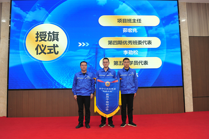 会上,茆宏兆副总将代表传承的班旗交于第四期新聘干部优秀班委李劲松,由李劲松将它传承给第五期学员代表陈栋。