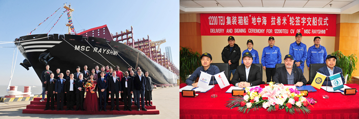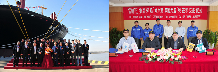 继9月30日,首制12200TEU超大型集装箱“MSC CAROLE”轮交付两个月后,同系列另外两艘新船也于近日提前完工交付。11月24日,命名人陈云女士,MSC中国区经理Giuseppe Gargiulo先生,SEASPAN资产整合部项目经理苏小华先生,MSC驻我集团现场办经理JH Son先生,现场办副经理羊海涛先生,挪威船级社(DNV)项目经理Surana先生,以及我集团总经理助理吉宏飞先生等相关领导和嘉宾出席了命名仪式。命名人陈云女士将两船分别命名为:“MSC ALANYA”轮和“MSC RAYSHMI”轮。