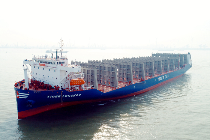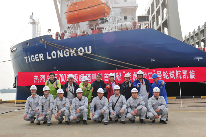 12月15日的新扬子造船码头,汽笛长鸣,彩旗招展。我集团为老虎燃气建造的首制700箱级罐箱甲板船,试航凯旋。