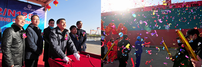 崔连军先生将两船分别命名为“中谷杭州”轮和“中谷福州”轮,并为新船砍缆、掷香槟礼,他祝福新船安全航行,满箱满载、为船东和各方带去源源不断的幸运和财富。