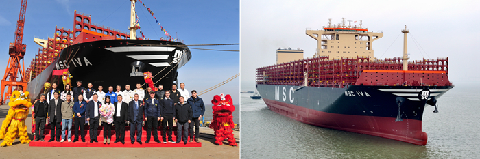 两船于2022年8月同时开工建造,2023年2月同时进坞并造,在MSC、SEASPAN公司现场监造组、DNV船级社、船厂上下员工等多方通力合作下顺利完工。同型共有9艘系列船,此次两艘船为系列船中的首批次船,交付后投入MSC(地中海航运)船队运营。两艘新船均由陈云女士为其命名,并掷香槟礼。嘉宾们共同与新船合影留念。祝福新船乘风破浪、顺达货满,为船员带来平安,为船东和合作各方带来财富和荣耀。