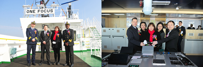 岳娟女士将新船命名为“ONE FOCUS”轮,为新船砍缆并掷香槟礼,拉响汽笛,祝福新船、随船船员航行平安,为船东和租家带来荣誉和财富。