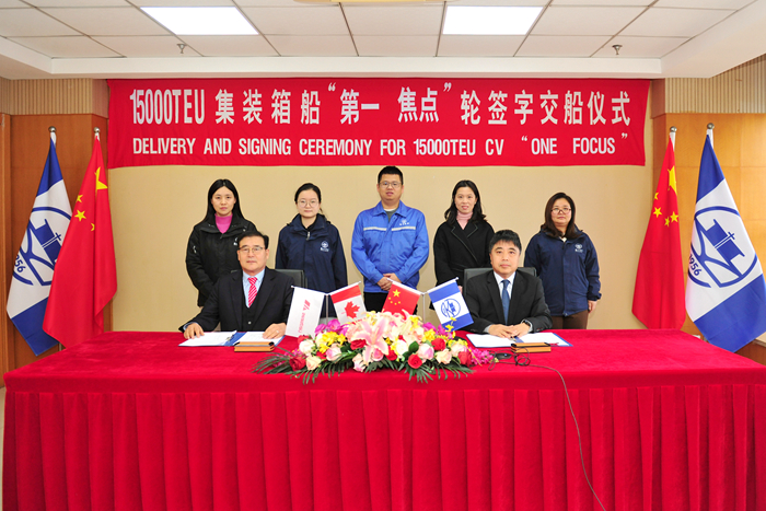 1月12日,在各方见证下,船东SEASPAN公司驻我司新造船现场办经理南相福先生,我集团副总经理兼新扬子造船总经理杜成忠先生分别代表双方签署交船文件。
