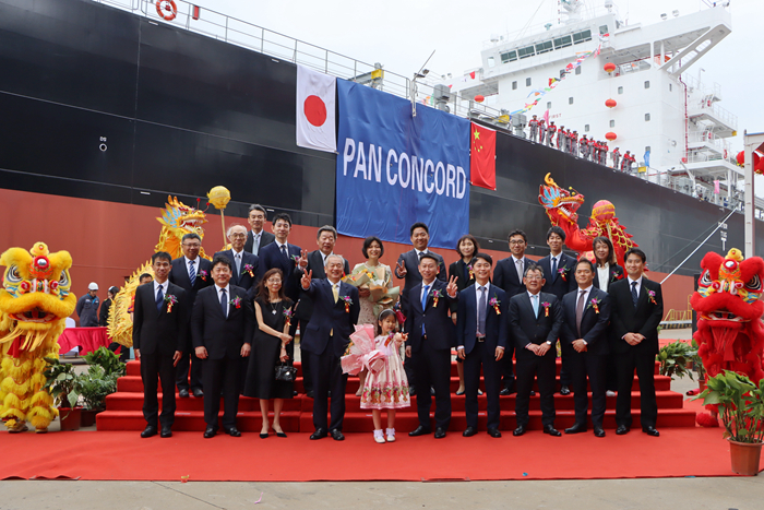 教父Jung Sangjin先生将新船命名为“PAN CONCORD ”轮,并祝愿她及随船船员航行平安,Sponsor橘侑花小姐为新船掷香槟。鞭炮、礼花齐响,汽笛共鸣,龙狮共舞,祝福新船一切顺利,为建造方带来荣誉,为船东带来好运与财富。大河内啓介先生表示对新船十分满意,并期待能与扬子三井再次合作。新船姊妹船也将于今年交付,扬子三井将在本船经验上继续努力,交出让船东满意的绿色高质量船舶。