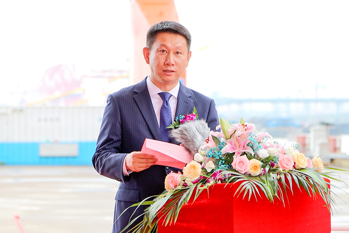 仪式开始,扬子三井总经理宋书明先生代表船厂发言。他表示:“感谢船东对扬子三井的信任和肯定,感谢NK船级社、PD监造组、三井物产和所有为本船建造做出贡献的扬子三井员工。本船是扬子三井66000DWT系列第六艘船,相较传统Ultramax,本船为宽体浅吃水设计,具有载货量更大和油耗更低等优势,能为船东创造更好的经济效益,也顺应了全球航运节能减排、环境友好的发展趋势。扬子三井将持续努力提升安全和品质管理,以客户满意为最高努力目标,为尊敬的客户建造更多更安全、更环保、性能更优的高端船舶,我们致力于成为全球最安全、最专业的绿色船舶建造者。”