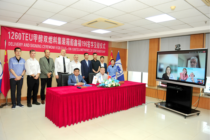 6月21日,X-PRESS FEEDERS新造船经理Bashar先生、我集团总经理助理兼扬子鑫福总经理杨雪彦先生以及各方代表出席交船签字仪式,见证新船交付。