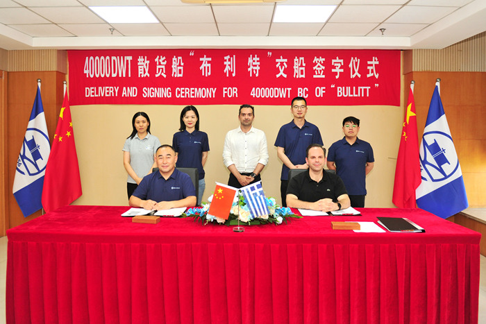 7月5日,Evalend船东代表Andreas Ploumis先生与我集团副总经理吉宏飞先生分别代表双方签署“BULLITT”轮交船文件。Evalend船东代表Loukas Lefas先生与我集团经营团队相关代表出席见证交船仪式。祝福新船、随船船员航行平安,顺达货满,为建造方带来荣誉,为船东和承租等各方带来好运与财富。