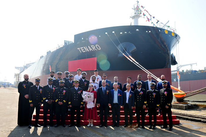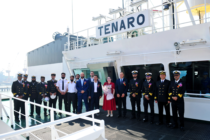 命名人Buturuga Laura-Stefania女士将新船命名为“TENARO”轮,为新船砍缆、掷香槟礼、拉响汽笛,并与嘉宾共同登船参观,祝福随船船员航行平安,为船东以及相关合作方带来荣誉和财富。
