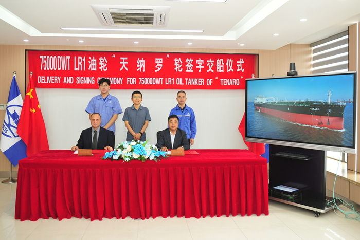 9月18日,Dynacom公司现场办经理Romeo Mustata先生,我集团副总经理兼新扬子造船总经理杜成忠先生分别代表双方签署交船文件。Romeo Mustata先生代表船东对该轮的建造质量和工艺给予高度赞赏。至此,我司为Dynacom船东建造的首批2艘75000DWT LR1型油轮项目顺利执行完毕。在此过程中双方形成了精诚协作、高效联动与互信支持的紧密关系,站在新的起点上,双方将积极推进下一个新项目尽快启动。