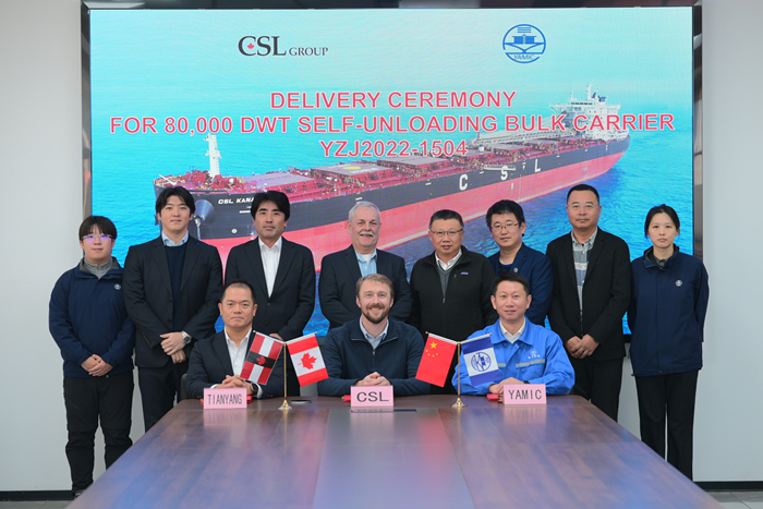 12月18日,船东代表Andrew Lennox先生、我集团副总经理兼扬子三井总经理宋书明先生及扬子三井CFO石丸雄次先生共同签署“CSL KANATA”轮交船文件。祝愿新船航行平安、满载顺达、一帆风顺!
