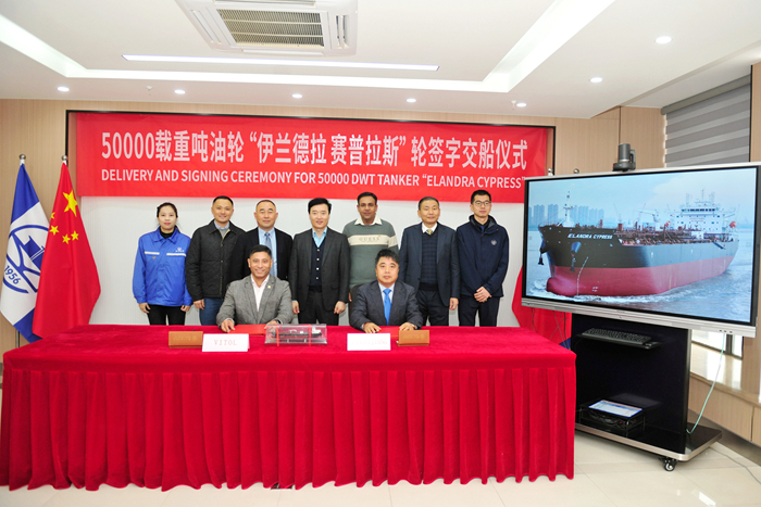 1月6日上午,在各方代表的见证下,维多国际航运公司总经理Rishab Bahl先生与我集团副总经理兼新扬子造船总经理杜成忠先生共同签署“ELANDRA CYPRESS”轮交船文件。该船是维多国际航运公司在中国定造的首批次新造船油轮项目之一,目前由我集团新扬子造船负责建造的两艘系列船顺利执行完毕。