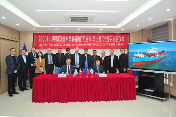 1月30日,在各方代表的共同见证下,马士基船队总监Frants Sommer Reuss先生与我集团副总经理兼新扬子造船总经理杜成忠先生分别代表双方签署“TANGIER MÆRSK”轮交船文件。