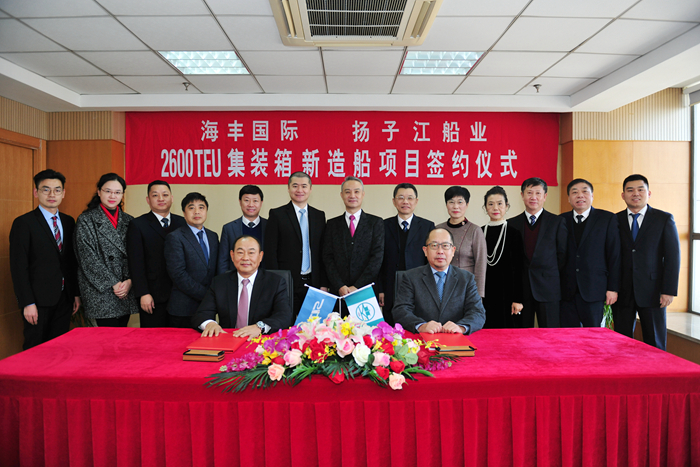我集团与海丰国际本年度第三次合作,12月19日,双方共同签署6+2+2艘2600TEU集装箱新造船建造合同。集团董事长任乐天先生,集团副总经理杜成忠先生、张涛先生,海丰国际董事局副主席兼首席执行官杨现祥先生携夫人,海丰航运集团副总裁肖森元先生,上海海事大学校长陆靖先生,上海海事大学商船学院党委书记曹红奋女士,上海海事大学商船学院院长肖英杰先生,上海船舶研究设计院院长吕智勇先生等共同见证新订单成功签约。