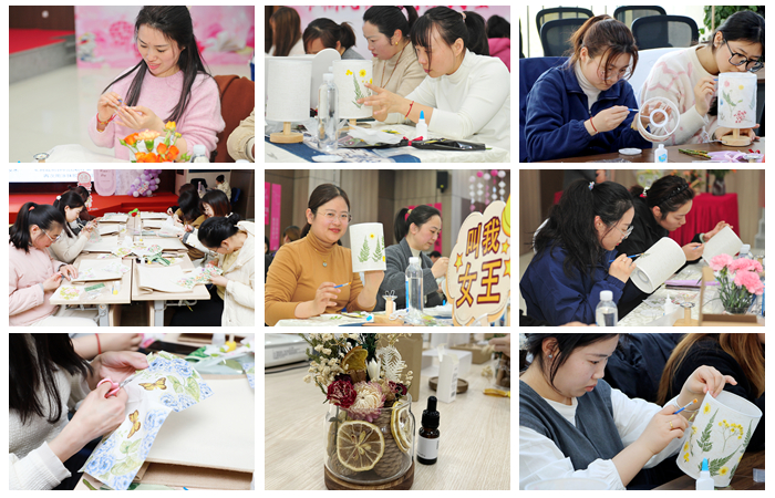 巧手匠心,创意无限。女职工们在专业老师的指导下,亲手制作了精美的古法压花台灯、蝶古巴特手工包和植物香薰。大家充分发挥创意,制作出独一无二的作品。手工制作不仅让大家体验到了动手的乐趣,也增进了同事之间的交流与互动。活动结束后,大家拿着自己亲手制作的作品,脸上洋溢着满足的笑容。