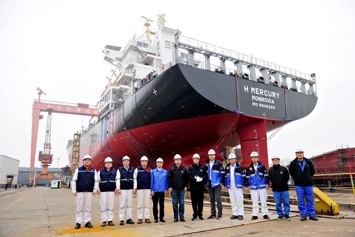 该船于2021年12月5日上船台,2022年2月14日下水。该船增加的气泡润滑减阻系统,压载舱和外板大量的结构修改,近300根管子氩弧焊焊接,大大增加了施工工作量,影响压载舱完整性。扬子长博生产部通过详细的计划安排,组织车间分区施工,同时克服了春节假期和劳动力匮乏的影响,比计划提前一天下水。