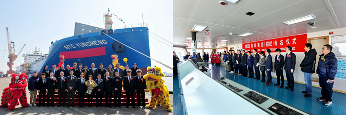 2月24日,海丰国际董事会秘书、运营管理中心总经理薛鹏先生;海丰航运集团总裁助理、海丰经纪总经理纪文光先生;上海海丰船舶管理中心总经理李瑞民先生;我集团副总经理杜成忠先生、副总经理张涛先生、总经理助理吉宏飞先生以及海丰国际部分投资者代表共同出席了该轮在新扬子造船码头的命名仪式。投资者代表中金公司高级经理刘钢贤先生将新船命名为“SITC YUNCHENG”轮,新船教母刘婧女士为新船砍缆并掷香槟礼,祝福新船顺达货满,平安启归。
