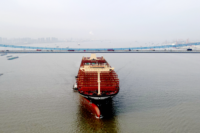 3月3日,该船顺利完成试航靠泊太仓扬子三井码头。该船选用国内首台WinGD 9X92DF主机,满足Tier III, 首创最大单气室C型罐作为超大型箱船的燃料舱,采用清洁能源LNG,可减少99%的二氧化硫,91%的颗粒物排放和92% 的氮氧化物排放,能效指数满足EEDI,Phase III。主机在SMCR工况下,每小时CO2排放量相对传统燃料模式下降24.3%。