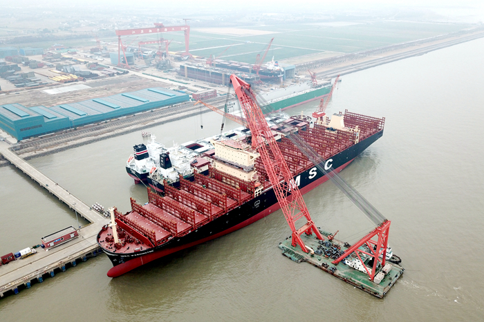 她,使用了全球最大的C型燃料罐。该船选用了C-LNG首次设计的LNG低压供气系统以及WIN-GD设计的首台9X92DF主机。她,将是地中海航运(MSC)投入运营的第一艘双燃料集装箱船。她,创造了同行业同船型试航时间最短记录。2月24日,由太仓海事局精心维护,安全出江试航。