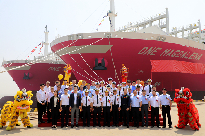 6月17日上午,“ONEPARANA”轮与同批次建造的“ONE MAGDALENA”轮同日在太仓进行了命名。命名人钱佳宁女士、王丹女士;SEASPAN公司高级副总裁李堃先生、资产部副总裁 J.J.迈耶先生、项目经理苏小华先生、新造船现场办经理南相福先生;LR船级社中部区总经理李毅先生;以及扬子鑫福造船总经理杨雪彦先生,总经理助理刘银君先生;中国信保江苏分公司项目险业务处交通运输科负责人童道平先生等领导和嘉宾出席了命名仪式。