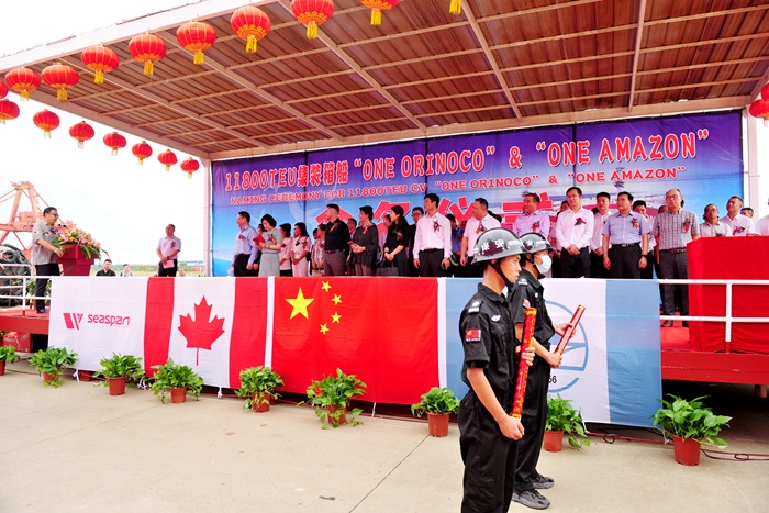8月25日上午,我集团扬子鑫福造船为SEASPAN船东在我司建造的第二批次两艘11800TEU集装箱姊妹船,举行了隆重的命名仪式。