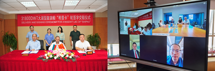 保加利亚国家航运公司高层代表,融资方代表和中间商代表等通过视频会议的方式,共同见证了“SHIPKA”轮的交付。保加利亚NAVIBULGAR航运公司现场办经理Nikolay Nikolov先生,我集团副总经理张涛先生、扬子鑫福造船总经理杨雪彦先生分别代表各方签署交船文件。