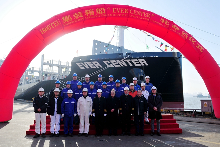 On the morning of January 29th, the first 1800TEU container ship built by Yangzijiang Shipbuilding for Japan's PSM Company was successfully christened and delivered in New Yangzi Shipbuilding. Mr. Masahiro Shimizu, the manager of the site office of the shipowner, named the new ship EVER CENTER and cut the line, threw champagne on ship, praying for its maiden voyage.