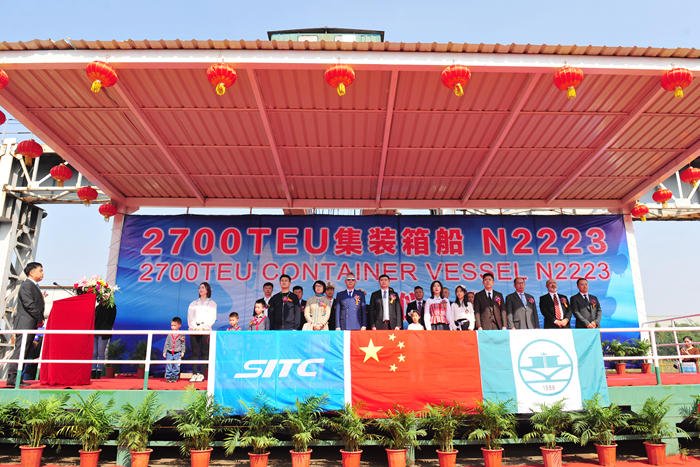 On the morning of October 30th, the christening ceremony of the fourth 2700TEU container ship m.v. Haifeng Licheng built by our group for SITC was held in NYZ. Mr. Yang Shaopeng, Chairman of SITC International and his wife, Ms. Yang Xin, Non-executive Director of SITC International, Mr. Mr. F. Higashi, President of ClassNK(China), Mr. Ren Letian, Chairman of our group, Mr. Du Chengzhong, Deputy General Manager of our group, Mr. Zhang Tao, Deputy General Manager of our group and other leaders and guests attended the ceremony.