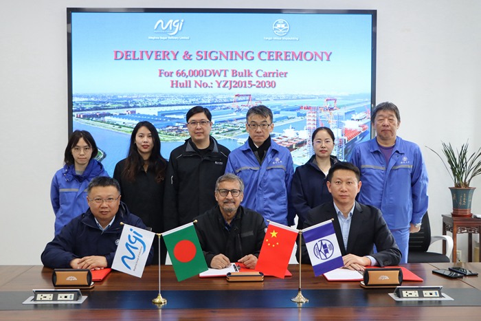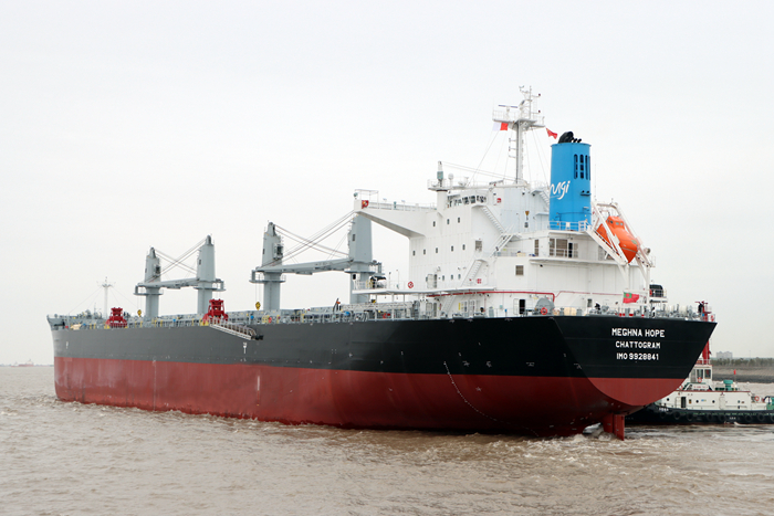 At 8:00 a.m. on March 24, the third 66000DWT bulkcarrier named "MEGHNA HOPE" (registered under the flag of Bangladesh)was successfully built and delivered by Yangzi Mitsui Shipbuilding Co.,Ltd.(YAMIC), to the Bangladesh shipowner, MEGHNA. The ship gracefully departedfrom the shipyard wharf, embarking on its maiden voyage after delivery.