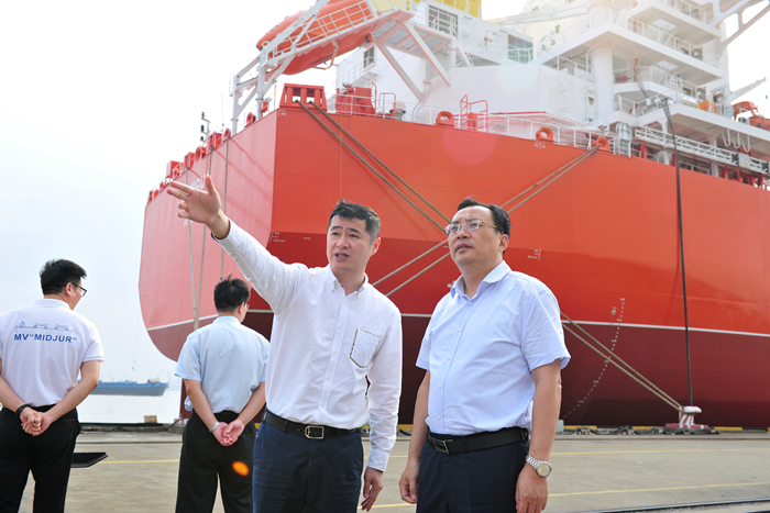 在新扬子造船生产现场,张书记详细了解了造船生产流程和现场在建船舶的产品结构、客户市场分布,他对富有扬子江特色的成本控制、生产经营、质量管理等方面的亮点给予了充分肯定。