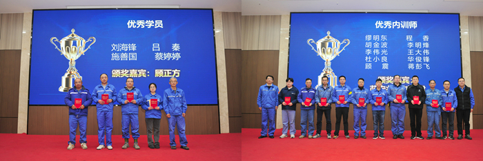在结业仪式上,4名优秀学员代表分别结合自身参与的《扬子江造船解决方案》(YSS 2.0)、电子化厂图等课题,分享了数字化转型实践中的经验与感悟。2025年集团内训师全年授课量达732课时,培训人次超2.5万,其中安环条线人均授课17课时,生产条线人均14课时,展现了内训师团队的强大赋能能力。现场表彰了4名“智改数转专项优秀学员”和10名“优秀内训师”,公司领导为获奖者颁发证书及奖金。