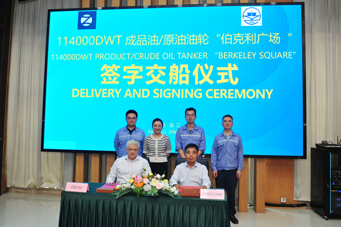 7月4日,Zodiac船东现场办经理Pavel.Vamesu先生,我集团副总经理兼新扬子造船总经理杜成忠先生分别代表双方签署交船文件。
