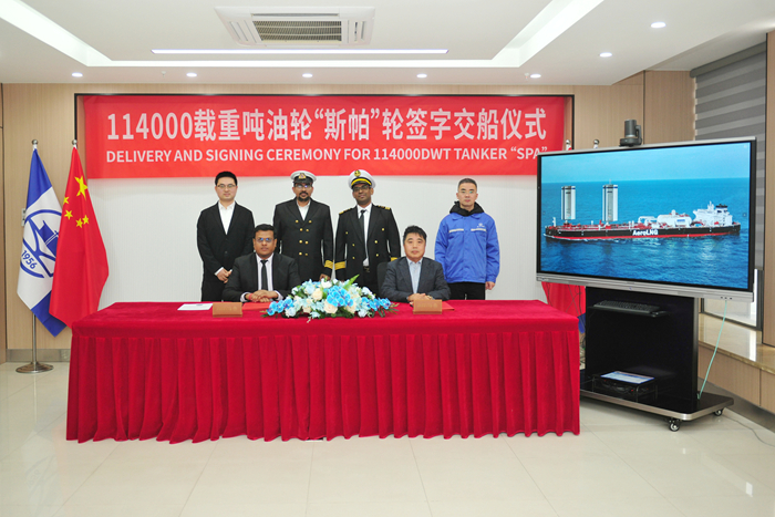 命名当天,船东公司代表abhi shek先生与我集团副总经理兼新扬子造船总经理杜成忠先生分别代表双方签署“SPA”轮交船文件。面对世界首制船型,从攻克风帆装置与船体结构的复杂匹配难题,到面对LNG双燃料系统的精密集成挑战,扬船人发扬“首制即精品”的工匠精神,进行技术攻关与工艺创新,在无数次的模拟优化与实船调试中,成功将蓝图变为现实。这艘船的顺利交付,为我们积累了宝贵的首制船建造数据与经验,填补了企业在又一个高端绿色船舶建造领域的技术空白,更全面验证了扬子江船业应对复杂船型的自主研发能力与精益建造水平,进一步提升了我们应对市场多样化需求的履约能力与技术储备,更为企业在激烈的国际船舶市场竞争中抢占了绿色智能高地。