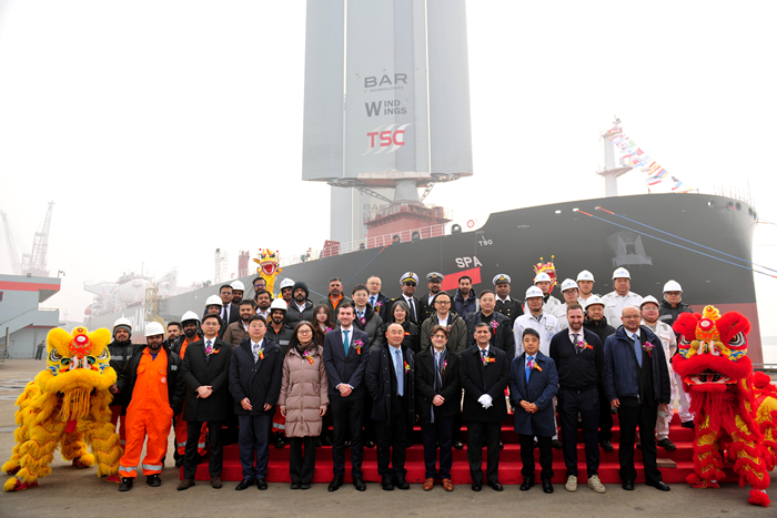 1月6日上午,我集团与船东UML公司共同为本船举行了隆重的命名仪式。命名人UML公司首席技术官Bhuvnesh Dogra先生,UML公司首席财务官Michael Kotsapas先生,劳氏船级社全球审图中心大中华区总代表傅宗政先生,中国进出口银行融资租赁部执行董事曹月女士,中国出口信用保险辽宁分公司副总经理王伟先生,希那基船舶管理公司中国区新造船项目经理陈召兴先生,以及我集团副总经理兼新扬子造船总经理杜成忠先生和相关领导、金融机构代表等嘉宾出席了仪式。命名人Bhuvnesh Dogra先生将新船命名为“SPA”轮,为新船砍缆、掷香槟礼。大家祝愿这艘巨轮航行万里、平安顺遂,为船东和租家带来源源不断的发展机遇与丰硕成果。