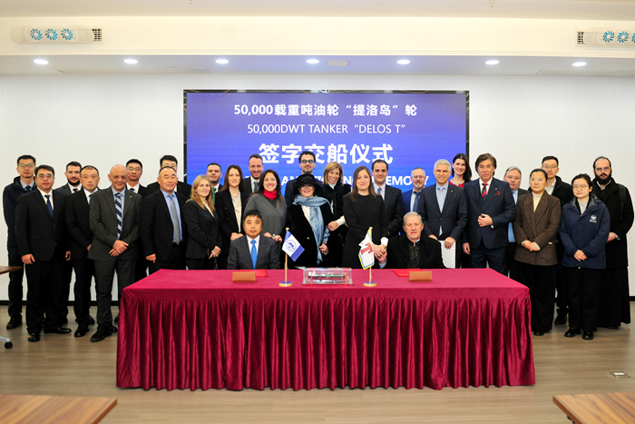 1月12日命名当天,TSAKOS集团副主席VASSILIS PAPAGEORGIOU先生与我集团副总经理兼新扬子造船总经理杜成忠先生分别代表双方签署“DELOS T”轮交船文件。