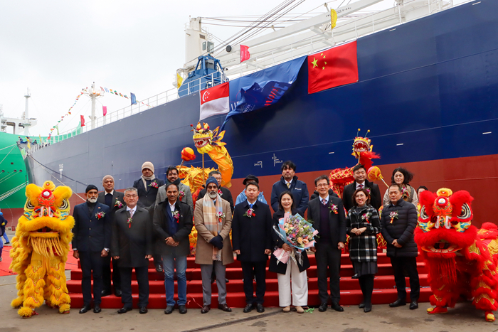 1月19日,扬子三井为该船举行了隆重的命名仪式。教母PSL财务副总裁Somprathana Thepnapaplern女士,PSL法务副总裁Sirasa Supawasin女士,JALDHI CEO Suresh Kumar先生,NK船级社中国区总裁柴户博先生,我集团副总经理兼扬子三井总经理宋书明先生以及各合作方代表、员工等代表参加了命名仪式。教母Somprathana Thepnapaplern女士命名该船为“UTHITA NAREE”轮。鞭炮、礼花齐响,汽笛共鸣。祝福新船和船员航行平安,为船东带来好运与财富,为NK船级社和船厂赢得荣誉。