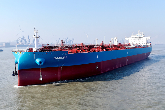 3月14日上午,我集团新扬子造船为船东Evalend建造的第四艘75000DWT LR1型油船“CAMARO”轮解缆离开船厂码头,交付投入运营。